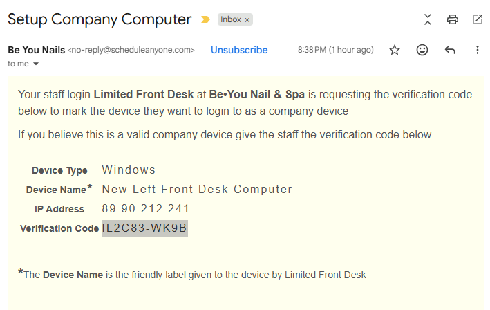 When a staff (who is only allowed to login on company devices) attempts to login on a non-company device ➜ given option to request verification code from admin